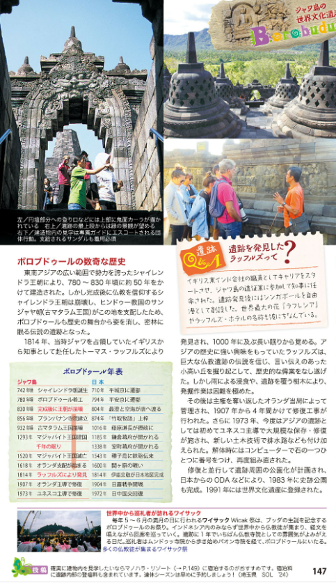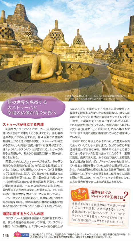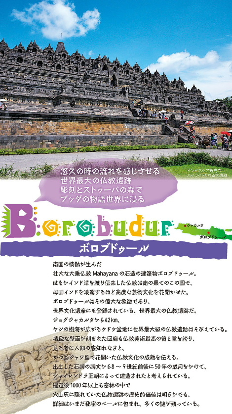 ボロブドゥール寺院は、インドネシア・ジャワ島中部のジョグジャカルタ郊外に位置する大規模な仏教遺跡で、世界最大級の仏教寺院です。ボロブドゥール寺院の周辺には、ムンドゥ寺院、パオン寺院などの遺跡群があり、まとめて「ボロブドゥール寺院遺跡群」として1991年にユネスコの世界遺産に登録されています。