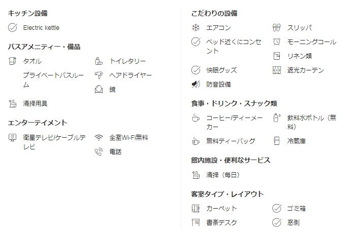 ドリンク, 無料スナック, コーヒー/ティー, 無料WiFi, 飲料水