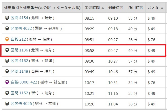 8:58 台北駅 ⇒ 9:47 瑞芳駅