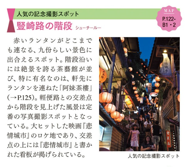 細い石畳の道に赤い提灯などが飾られた豎崎路の写真は、台湾や九份のガイドブックの表紙などにもよく使われていることから、見たことがある人も多いでしょう。